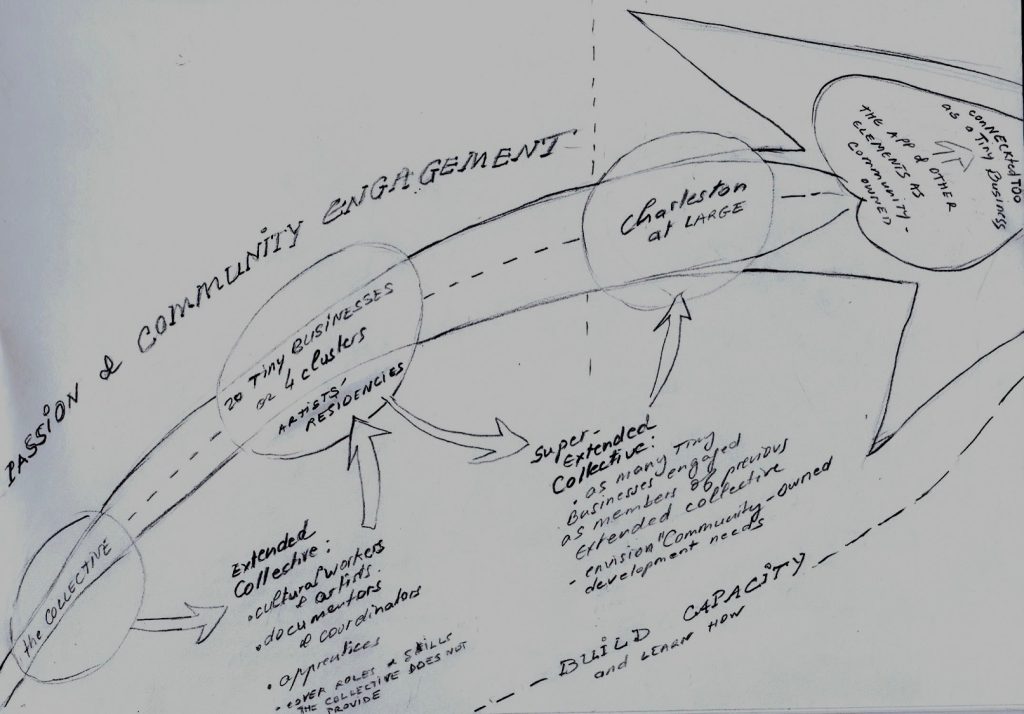 We clearly see the difficulties of collaboration. The priorities of what we call Communities relate to the needs of one’s family or to events which concern one’s social group. Artists are on a journey as observers/actors/fabricators and searching for unknown representations, communications or transformations. Educators concentrate on the needs of students. Activists’ priorities are dictated by political organizing. Relationship to work and money need to be exposed. An invitation is never enough. And silence is a response that is not satisfying. However it is good to know that THE TIME IT MAY TAKE TO CREATE TOGETHER A COMMON GROUND, IS SHORTER THAN the time it takes elected OFFICIALS to understand the needs for advancing MASS TRANSIT in Charleston, or an EQUAL EDUCATION FOR ALL. Collaboration across races and generations is a worthy cause to try and stick to it. Social Justice and Community Building depend on never stopping, with one’s own tools.